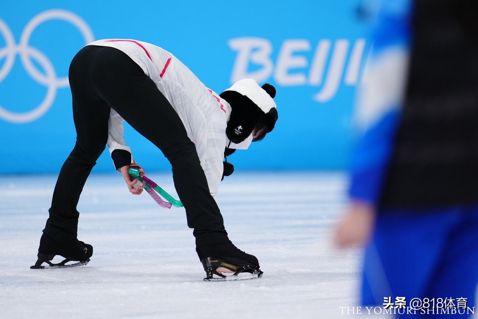 而头戴着冰墩墩帽子的羽生结弦并未离去,他先是抚摸了冰场,然后非常暖心地向补冰工作人员们表示感谢,留下来拿起工具和大家一起补冰。