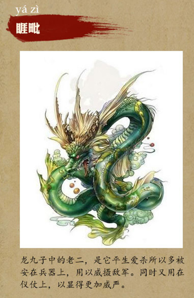 睚眦,嗜杀喜斗,刻镂于刀环、剑柄吞口