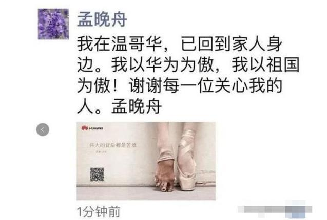 孟晚舟女士朋友圈报平安