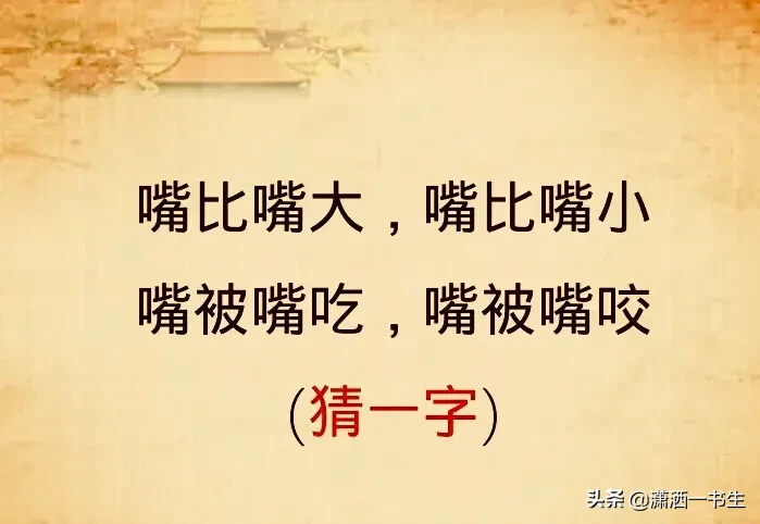 一口咬掉牛尾巴谜底(谜底答案是什么字) 新梦想 • 2022年1月8日 13:36:28 • 生活常识 • 阅读 2725 猜字谜多有趣,锻炼大脑又学字,周末在家别松懈,一起猜谜长知识。别人都说我们文化高,今儿5个字谜来考一考,答对一半不算好,全部知道才叫高。请听题: 请作答(限时一分钟哦)。 版权声明:本文内容由互联网用户自发贡献,该文观点仅代表作者本人。本站仅提供信息存储空间服务,不拥有所有权,不承担相关法律责任。如发现本站有涉嫌抄袭侵权/违法违规的内容, 请发送邮件至 1543690857@qq.com 举报,一经查实,本站将立刻删除。 赞 (2) 新梦想 0 生成海报 相关推荐 生活常识 什么叫做柏拉图式的爱恋(柏拉图式爱情=精神恋爱吗) 我们经常提到“柏拉图式爱情”这个词,用来代指那些不涉及肉欲的纯洁的精神恋爱。 但这是柏拉图的本意吗? 换个问法,爱情没有肉欲,真的可能吗? 作为人类历史上最伟大的哲学家之一,柏拉图… 新梦想 2022年6月8日 生活常识 高压锅煮粽子要多久(煮粽子牢记5个技巧) 煮粽子,最忌直接加水煮,牢记5个技巧,粽子软糯不夹生,香味浓 端午节马上就要到了,传统节庆食物“粽子”准备好了吗?这一天,全国人民都会吃粽子,不同的是,有些人的粽子是买的,也有些是… 新梦想 2022年6月16日 生活常识 抖音网红排行前十名(2021抖音十大网红排行榜) 截止到2021年8月2日8:08分,抖音粉丝排行榜最新出炉。 前夜7月29日,被刘德华关闭打赏直播间一个亿的流量刷屏了,刘德华排第几名咧? 我们先来说说第一名吧。 第一名是“人民日… 新梦想 2022年3月16日 生活常识 第一届奥运会开始的时间(奥运会历史简介) 公元前776年夏天第一届奥运会于希腊南部的奥林匹亚举行,奥运会是为了纪念古希腊最著名的神——众神之王宙斯而创立的。 宙斯神像 宙斯是古希腊人共同的神,由于不同的部落之间经常发生战争… 新梦想 2022年6月20日 生活常识 汶川地震不公开的秘密(为什么汶川地震中很多佛像却毫发无损) 大家都知道地震是无法避免的自然灾害,它的发生原因非常复杂,自古以来地震曾给人类带来许多伤害和无法挽回的损失。相比过去现在发生地震以后,都能得到多方支援,让灾区人民尽快实现重建家园。… 新梦想 2022年4月20日 生活常识 华为补电代码是多少(一文详解华为补电为什么进不去) 华为手机的“补电”功能位于“工程菜单”中,需要通过代码*#*#2468579#*#*开启。 使用方法“补电”是华为手机工程菜单中的一项分支功能,它的主要作用是校正电池容量参数,如果… 新梦想 2022年1月10日
